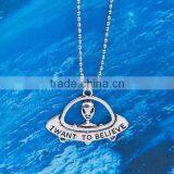 New Fashion Copper Necklace Alien Flying Saucer Antique Silver Message " I WANT TO BELIEVE " Carved 61.0cm Long