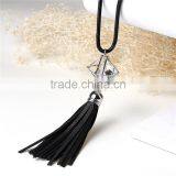 New Fashion Long Snake Chain Black Leatheroid Tassel Pendant Clear Glass Rhinestone Sweater Necklace