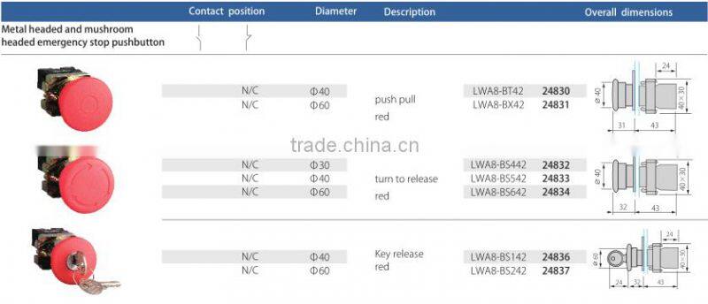 emergency red color flush push button switch metal headed LWA8-BA3341