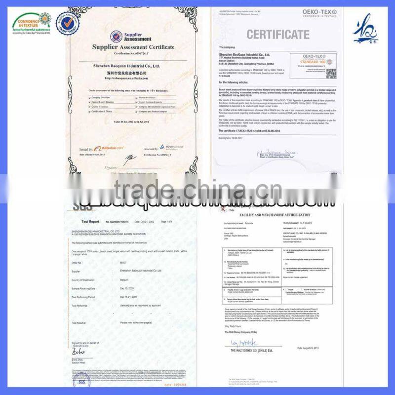 Established in 2003 ,  SHEN ZHEN BAOQUAN INDUSTRIAL CO., LTD    is a manufacturer and trader specialized in the research, development and production of terry towel, beach towel,  compress towel, jacquard towel, microfiber towel, hooded towel, bamboo towel, car washing microfiber cloth etc.We are located in  SHENZHEN with convenient transportation access.All of our products comply with international quality standards and are greatly appreciated in a variety of different markets throughout the world.