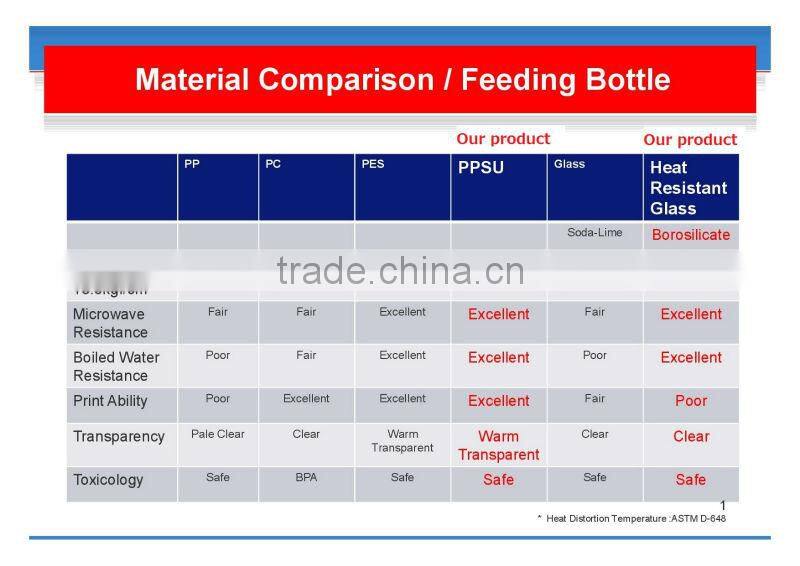 PPSU (=Poly Phenyl Sulfone) is new material, which does not contain BPA (=Bisphenol A). Suitable for newborn babies.Japan New Feeding Bottle PPSU (BPA free) with Silicone Teat 240ml Wholesale