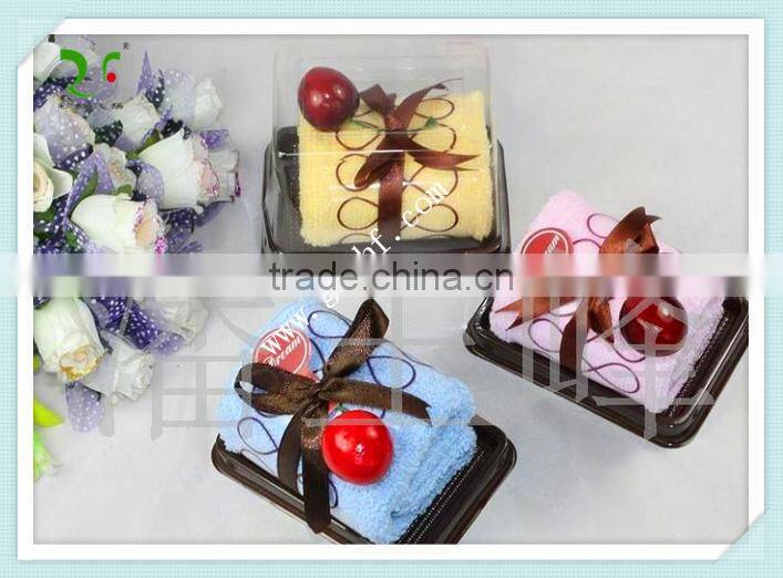 1.Present towel as promotion gift can be made of microfiber or cotton material,looks like a real cake we can make many kinds of sizes and shapes according to your requirements