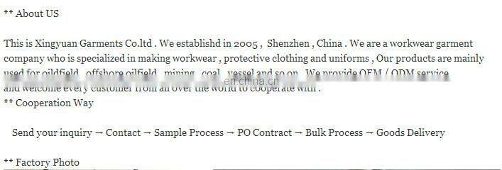 | 2.Shell fabric: Multi choices on fabric selections, example: 65% polyester 35% cotton/100% cotton with fire resistance, water proff, oil resistance,acidproof, anti-shrink, anti-wrinkle finishing. | ||