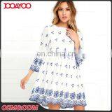 Fashion Three Quarter Sleeve Blue Ivory Lady Vintage Embroidered Dress