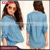 Fashion v Neck Chambray Fabric Woman Blue Blouse Half Sleeve Ladies Tops