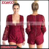 Adult Lady Deep V Neck Long Hollow Out Sleeve Wine Red Lace Boutique Womens Romper
