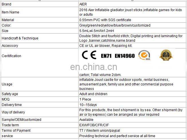 2016 Aier Newest Factory Price Inflatable Sport Games Gladiator Joust for Sale
