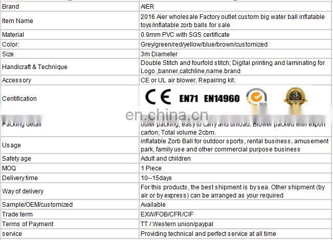 Home > Products > Inflatable Sports > 2016 Aier Wholesale Factory Outlet Custom Big Water Ball Inflatable Toys/inflatable Zorb Balls for Sale