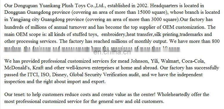 We specialize in the plush toys field for more years, perennially offer all kinds of plush toys such as teddy bear series. animal toy, doll toy, pack bag toy, even the famous brand animal toy etc.,if you can provide the certificate of them. we will be the best choice for the bulk production .the material used meet the USA and European standard, we can customize your order, supply samples as you want in 5-7 working days.
