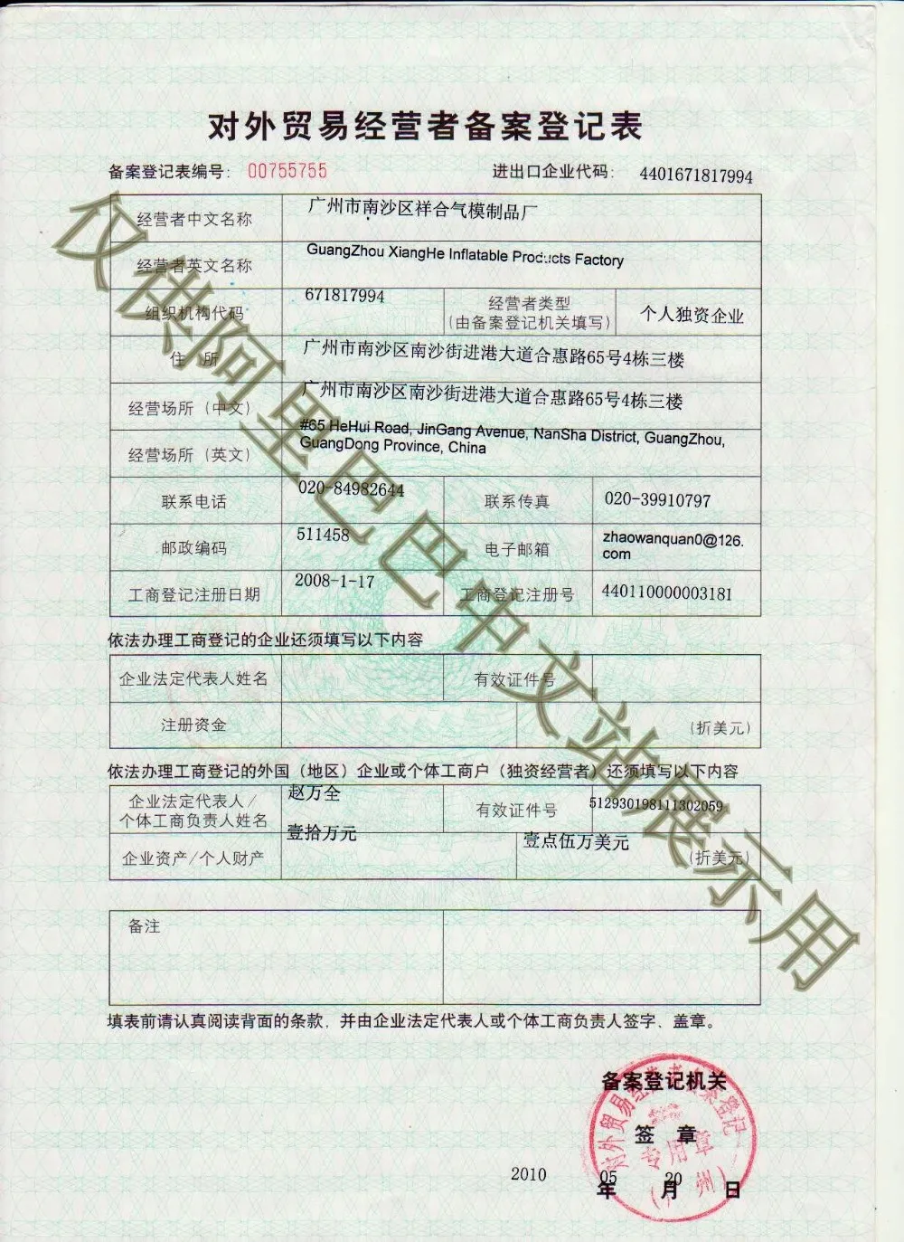 GuangZhou XiangHe Inflatable Products Factory established in January, 2001, Located at National Economic and Technology Development Zone---The Western industrial Zone of GuangZhou NanSha Economic and Technology Development Zone; We are specializing in development, manufacture and sale inflatable play structures. We offer high quality commercial grade inflatables for sale such as bouncy castles, bouncers, slides, combo units, interactive games, obstacle courses, water walking ball, zorb balls, sports, inflatable boat, inflatable water slides, water trampoline, water seesaw and more’s mimarket and high-end products.