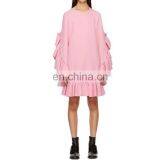 Fashion Crewneck Pink Long Sleeve Ruffle Dress Flared Cuffs Stretch Crep Casual Dress With Welt Pocket At Waist