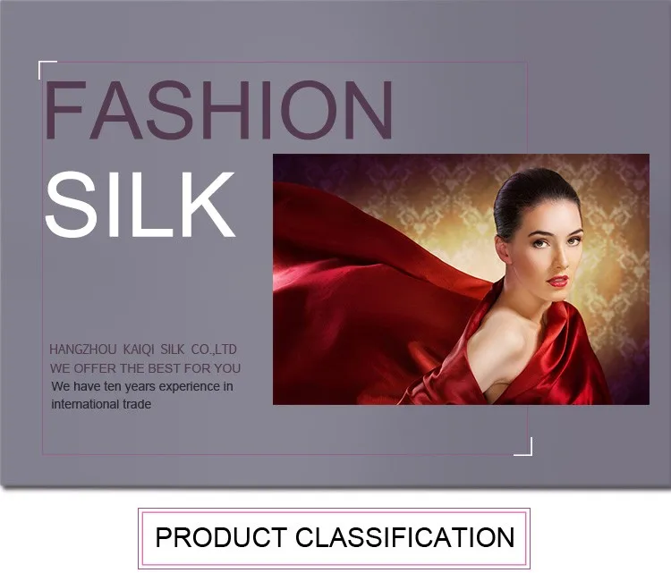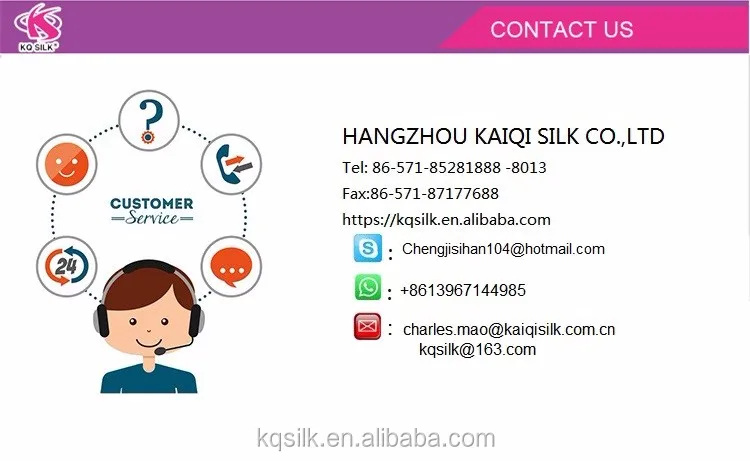 Hangzhou KaiQi Silk Co., Ltd. is located in Hangzhou city, the "Silk Heaven". We combine weaving and dyeing as our main business scope. We target at medium and high ranking series of silk fabrics and scarves with our own brand "AIWIBMA". Our products are well selling in China and have been exported to many countries regions, such as Europe, the Middle East, America, Japan, and Arabia and cherished by customers both at home and abroad. During our endeavor to promote the Chinese silk to the world, we wait here sincerely to cooperate with all walks of textile area in the world either in business field or trade field.