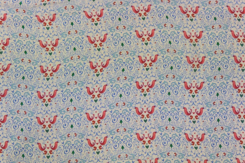 Organic Stretch Silk Satin Charmeuse Fabric With Embroidery-like Flower Birds Pattern