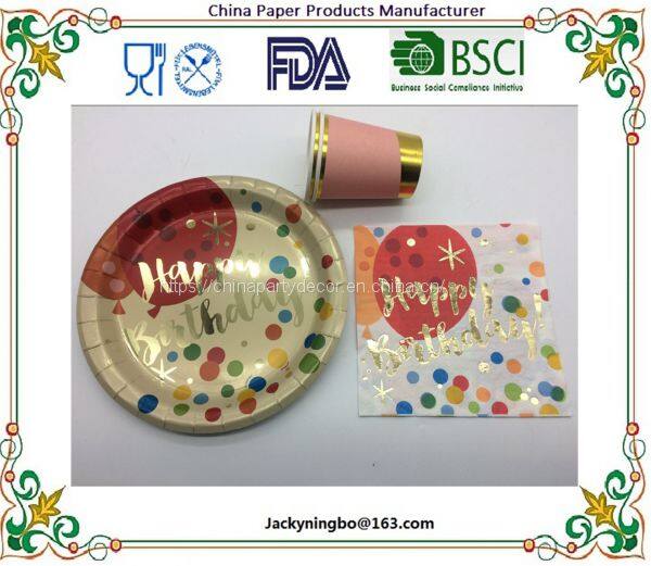 Ningbo PartyKing Holiday Colorful Printed Gold Foil Paper Plates Cups and Napkins Party Tableware Pack - Service for 12