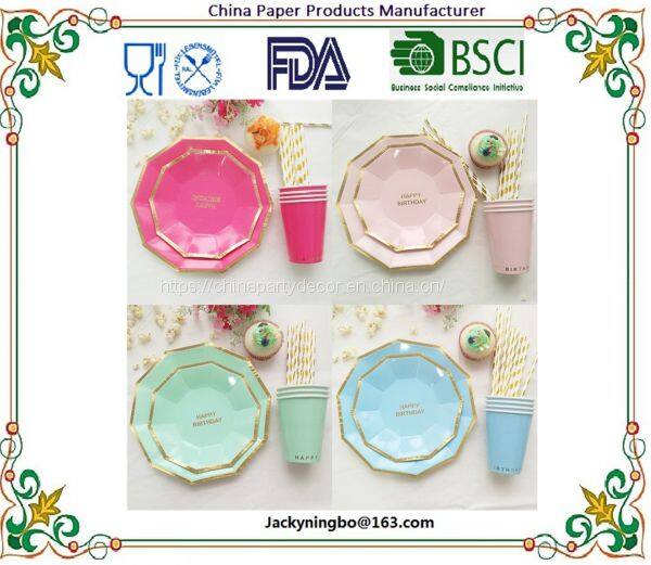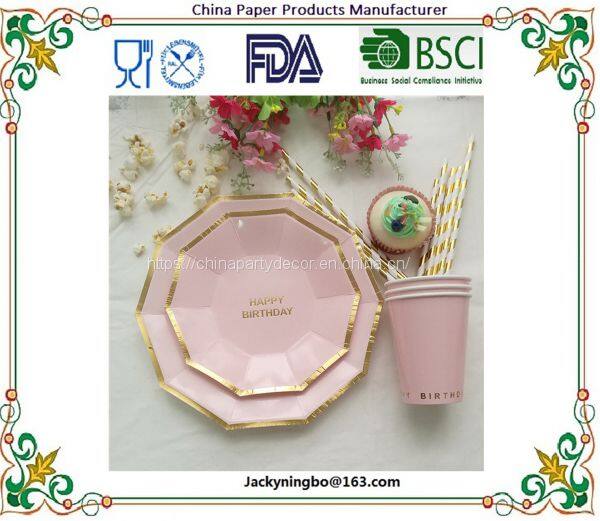 | Name | Gold Foil Paper Tableware Pink Striped Dessert Plates Drinking Straws Cups Party Napkins for Gold Foil Theme Event Party |