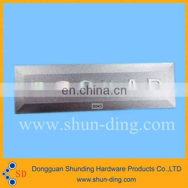 DongGuan ShunDing hardware product CO.,LTD is located in DongCheng district of DongGuan city in GuangDong province which is very convenient transported city. We are a experienced enterprise with advanced equipment and strong technical force specializing in various kinds of metal plate,nameplates,shoe and luggage accessories ,metal tags , and other metal crafts. Since its creation,we always adheres to the principle of customers first and are always highly praised by customers at home and abroad via agile pragmatic management and scientific management system. Maybe you have an idea to change or order your tags or nameplates.The heart is inferior to move. Lets begin now.Our company will help you to design it according to your image.If you feel the design is good, lets start the project and make our clients get more surprise. We will provide high quality products and promote your product's brand value. Contact us now!