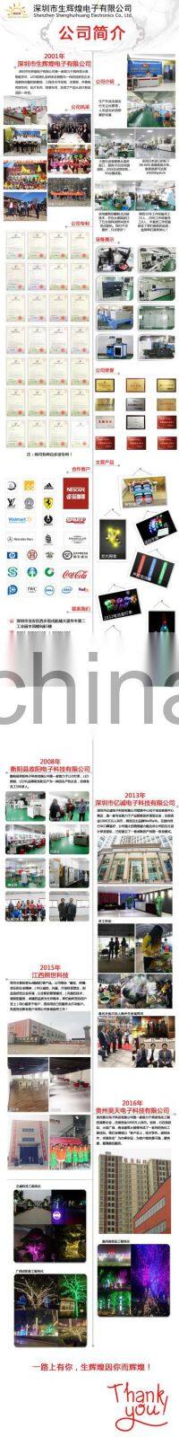 Shenzhen Shenghuihuang Electronics Co., Ltd, established in 2001, is a professional high-tech enterprise in Shenzhen, China. We are fully committed to producing technologically advanced LED promotional gifts, flashing novelties, blinking Ornaments & light up souvenirs.