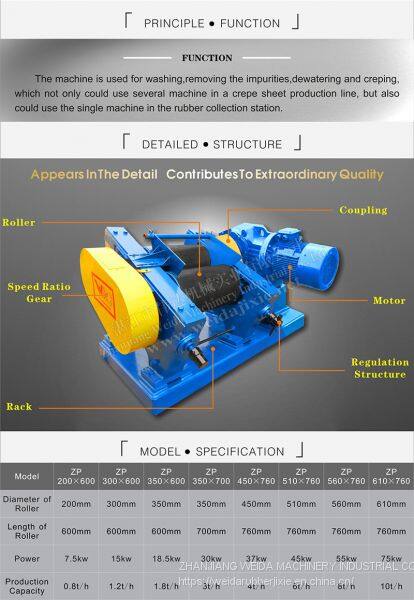 Creper is used for washing,removing the impurities,dewatering and creping, which not only could use several machine in a crepe sheet production line, but also could use the single machine in the rubber collection station.