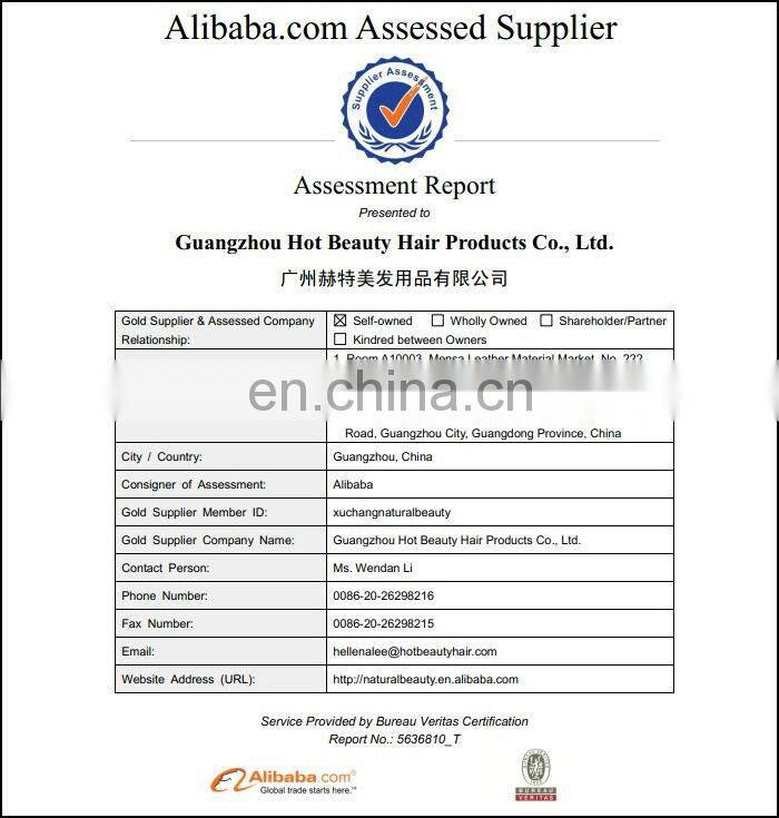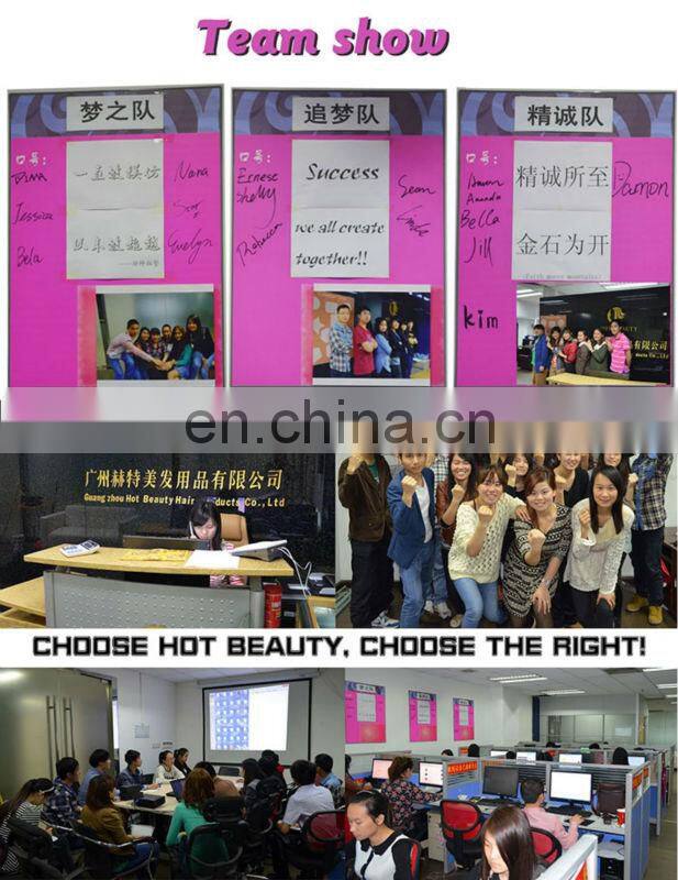 Why choose us?1.We are a factory which have specialized in hair extension area for more than 7 yrs.2.Delivery rate=100%3.Quality success rate > 99%. Strictly QC control.4.Reply you within 12Hour.5.We do many testings on products before delivery. Guangzhou Hot Beauty Hair Products company is the head office in Guangzhou city, including 2 shops in different markets for civil and export market and one exportation trading department office. We have a factory locates in Xuchang city,Henan province,China. Our main products are different kinds of virgin remy hair extension, human hair wigs and lace wigs. Because have sales shops,we always keep the hair in stock. Also, from the sales market,we can get the first fashion information, then produce the best quality hair to keep them in stock for sale. We can also do your custom order to meet your own satisfactory!Our company sets up several departments, including production department, sales department, quality control department and sevice center,etc. only for accomplish the good-quality product to meet customer's demand, all of our products have been strictly inspected before shipment.We always think about the question on the side of the customers,because you win,we win!