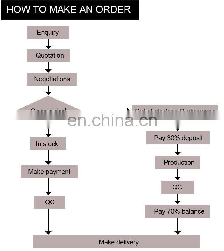 Send inquiry----Quotation-----Confirm the quotaiton-----Receiving PI--------Payment for deposit or full amount----------Bulk production----------Quality control--------Delivery