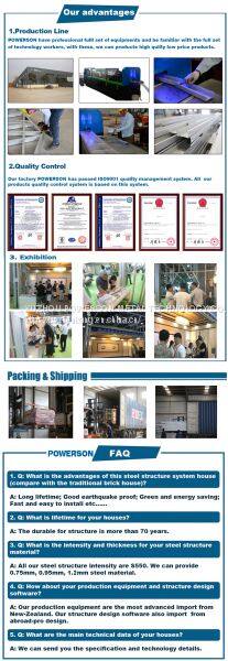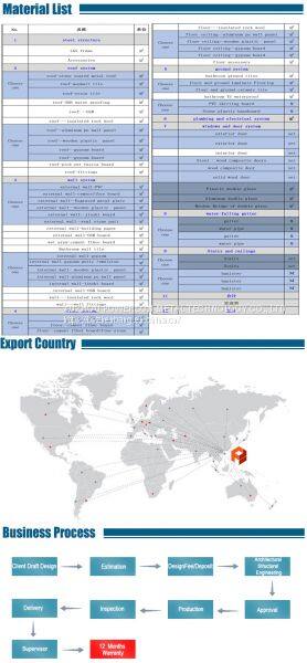 1) Lifetime for structure: 100 years. 3) Wind resistance: max 60m/s. 5) Snow resistance: max 2.9KN/m2as required 7) High acoustic insulation: 60db of exterior wall 40db of interior wall 9) Ventilation: a combination of natural ventilation or air supply keep the indoor air fresh and clean 11) Installation: the average is one worker one day install one SQM.  |