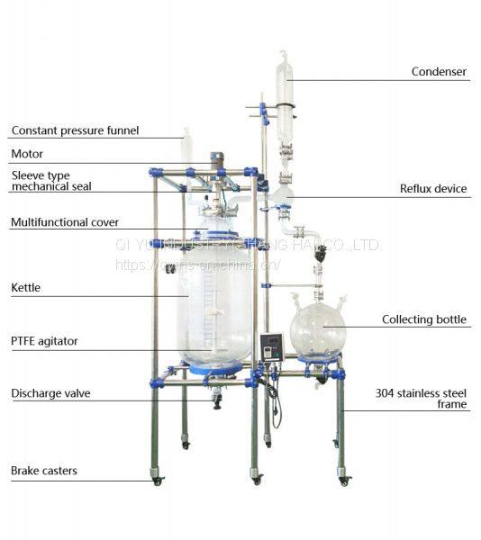 Different cold and hot circulating fluid (hot water / hot oil / freezing liquid) can be put into the layer of double glass reactor. In the sealed glass container, the reactants are stirred and distilled at normal pressure or negative pressure and can be used for various biochemical synthesis reactions under constant temperature conditions, and can also be reflux or distilled at different temperatures.The reaction kettle covers different openings to realize the different effects of feeding, measuring temperature, recovering distillates and so on.