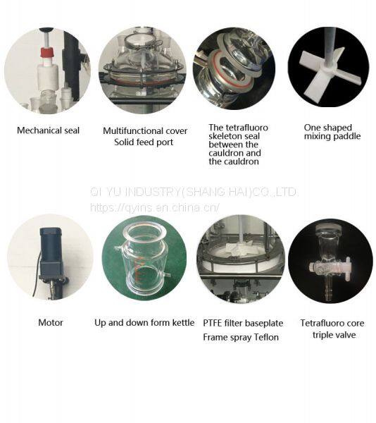 The kettle is a single layer or a jacket. The cooling solution and the heating liquid are available between the jacket. The unique design of the filter plate at the bottom of the kettle is that the equipment can withstand the pressure of up to 100KG reaction liquid and avoid the dead body at the bottom of thereactor. The filter is made of PTFE material and connected to the kettle through flange, which is convenient for dismantling, cleaning and replacing.