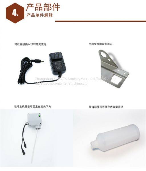 1) Automatic on/off: Soap dispenser automatically supplies foam soap as the dispense-time set as soon as hands in sensor range. Soap dispenser automatically stops working if hands out of sensor range..