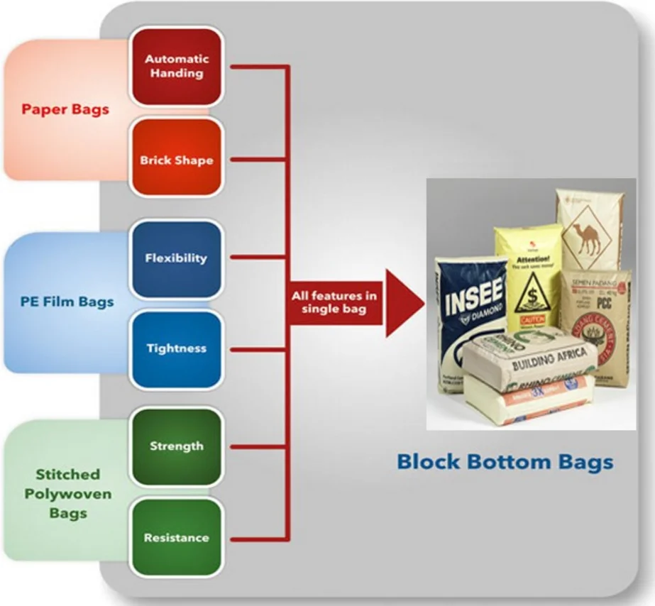 Compared with the traditional 3-ply multi-wall paper cement bag and ordinary pp woven plastic bag, the Ad*Starkon block bottom valve sacks have the following advantages: