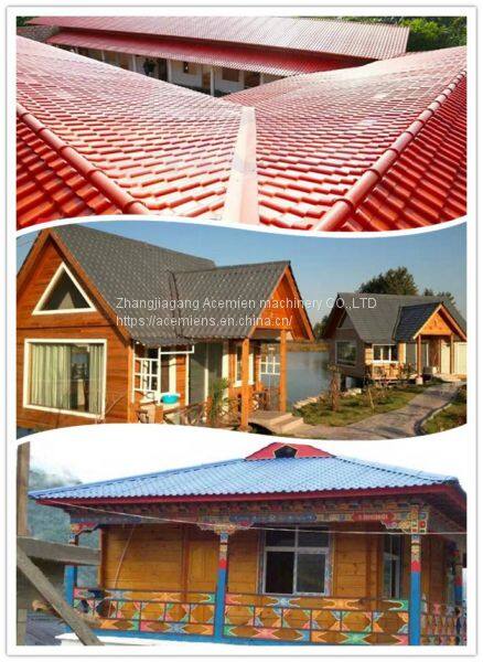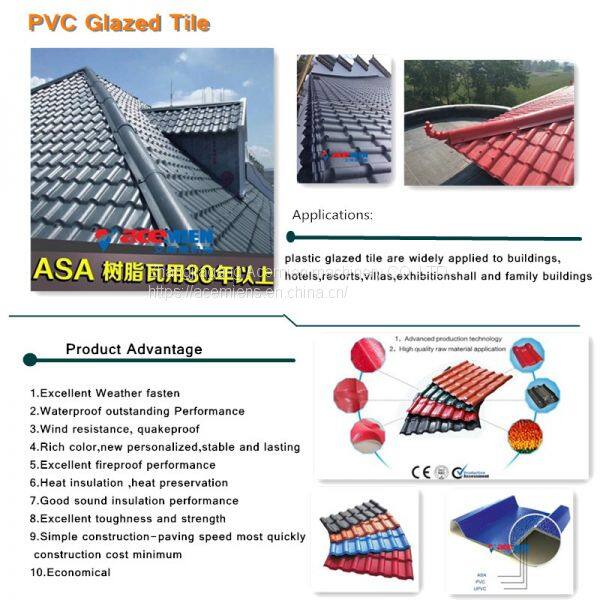 | Final product | Main tile:1set Two layers PVC+ASA Roofing tile; Width:720/880 /1040mm,Thickness: 2~3.0mm; Wave distance:160mm; Wave height:28/30mm; Wave length:220/250mm Ridge tile:4sets |