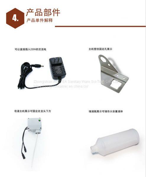 Zhongshan ACEYEA Sanitary Ware Co., Ltd. is a professional manufacturer of intelligent bathroom appliances, the company introduced the United States and Germany technology. With the United States, Germany, the United Kingdom, Canada, Hong Kong, Taiwan and other customers to supply and develop a new tap-type sensor soap. The products are newly designed by American designers, and their products are sold at home and abroad. The company's products are the cooperative suppliers of many well-known brand enterprises. The products are currently used by Baidu, Ocean Real Estate, Times Real Estate, Henglong Real Estate, Erie, Mengniu, Hilton Hotel, Vienna Hotel, Daoxiang Hotel, Guangzhou Zhou Dafu Financial Center, Shanghai American College and other world-renowned enterprises. Products are widely used in office buildings, shopping malls, plazas, hospitals, stations, airports, hotels and other commercial places.This product adopts infrared automatic induction technology, and can automatically induce soap liquid. Every time the soap dispenser is quantified, the waste of hand washing liquid can be avoided. The product is installed by faucet type, which can ensure that the excess hand washing liquid falls into the basin to avoid the common soap droplets dirty on the table surface and corrosion of the table surface. Our products are all made of brass chrome plating. The products are made of advanced multi-layer plating technology, which can ensure the durable brightness of the products. The product uses the Sino US technology development soap liquid pump, the service life is long, the sound is low, the power consumption is small and so on. At present, our products are widely used in many high-grade commercial public health places at home and abroad. Our products are also exported to the United States, Canada, Turkey, India, Malaysia, Singapore, Hong Kong, Taiwan and other places. We have the cooperation of agents and distributors in the United States, Turkey, India and other markets, so that good quality can be established for a long time. Cooperative relationship, we welcome the domestic distribution partners, business partners to establish long-term business relations with us. We will provide perfect pre-sale and after-sales service. You are welcome to contact us anytime!We promise that we will provide 2 years free warranty for products purchased in our store. The damaged product is free of repair within 2 years, free of charge and replacement of related parts. The customers in Guangdong provide mail delivery and spare parts maintenance. The main part of the product offers 5 years of quality assurance. Non-human damage for 5 years free replacement! We welcome all major businesses to buy and sell our products.