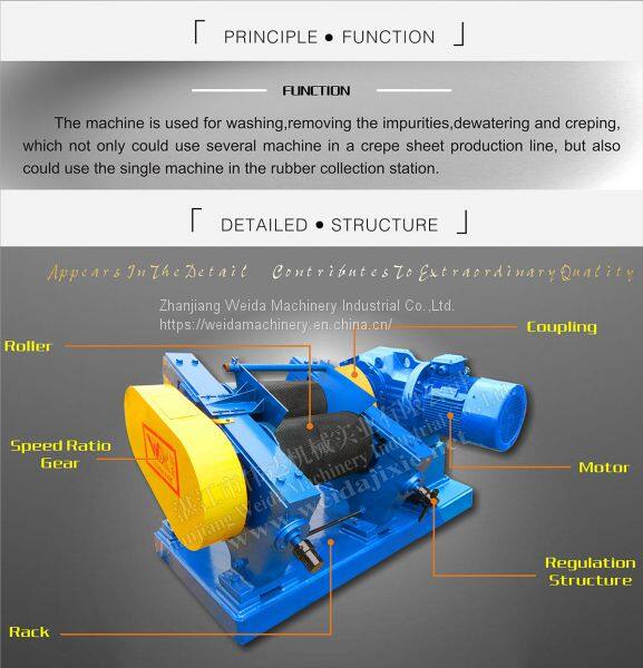 This machine consists of a pair of rollers with diamond groove, rack and transmission system. By the relative movement of the front&back rollers, the machine presses and flattens the raw material, dewatering the rubber and removing the impurities. Due to different speeds between the two rollers, the raw material is pressed to crepe sheet with honeycomb surface. The machine is very easy to operate and is with the features of compact structure, high efficiency, low noise and low power consumption etc.