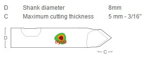Knife blade with 8mm cylindrical shaft for use with the RM (RIgidMaterial) knife tool. Good blade for cutting in rigid materials such as different gasket materials, forex, and solid carton board. 2 times 40 degrees angle.