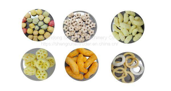 Puffed snacks production line includes mixing, extruding, conveying, drying, flavoring, cooling system. It's full automatic. Puffed snacks can be directly extruded from the extruder that produce all kinds of snacks and different shapes by adjusting the mould. The shapes includes cheese balls, corn curls, corn sticks, coco pops, stars,flower and etc. It can take corn, rice, wheat, oat, rye and other cereals powder as raw materials to produce extruded snacks, with crispy taste and lively shape. And it's designed according to market demand.