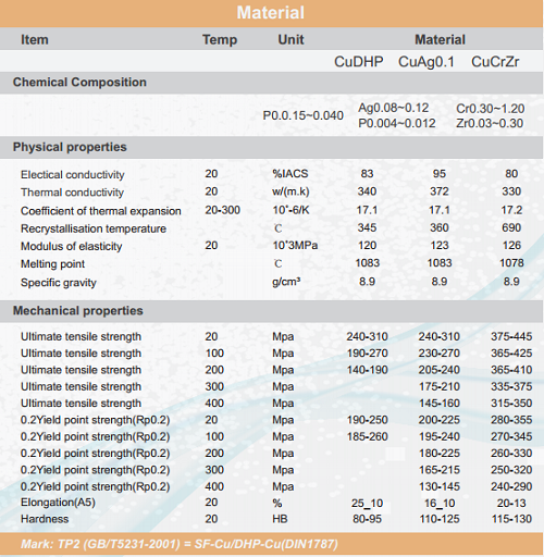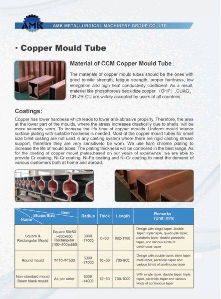 The materials of copper mould tubes should be the ones with good tensile strength, fatigue strength, proper hardness, low elongation and high heat conductivity coefficient. As a result, material like phosphorous deoxidize copper (DHP),CUAG,CR-ZR-CU are widely accepted by users of all countries.