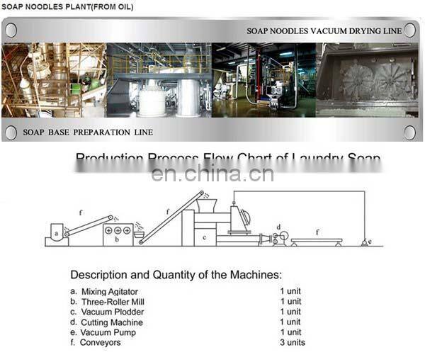 Saponification--> Vacuum drying --> Soap noodle --> Grinding --> Vacuum extruding --> Cutting.