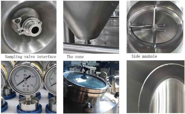 6.With: CIP arm with spray ball, pressure gauge, Mechanical pressure regulating valve, CO2 adding device, sampling valve, breath valve, Ice water solenoid valve, thermometer, etc.