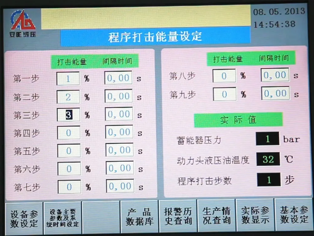 Hit energy can be controlled at ±1.5% though touch screen. After testing 4 copper columns, deviation in height is ≤0.3mm. after change forging dies, input the die height, the system can automatically adjust parameters to assure energy’s identity and accuracy.