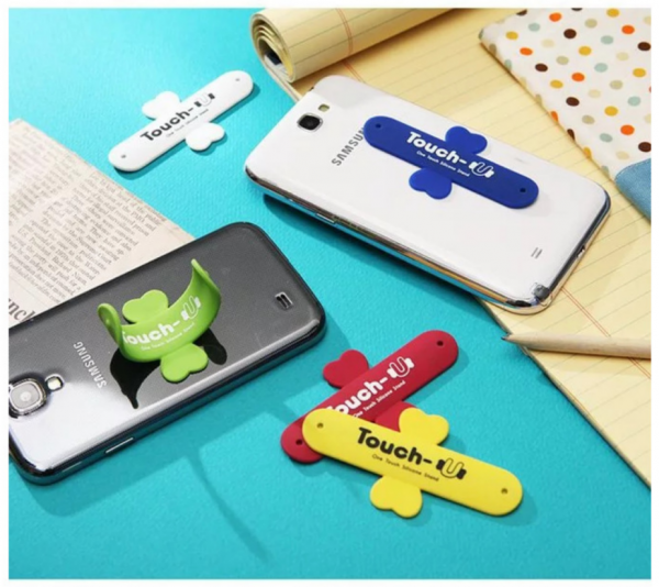 Silicone mobile phone stand is a smartphone accessory which is very flat and attached to the backside of the phone. When you press it in the middle it will magically open up and becomes a stand.