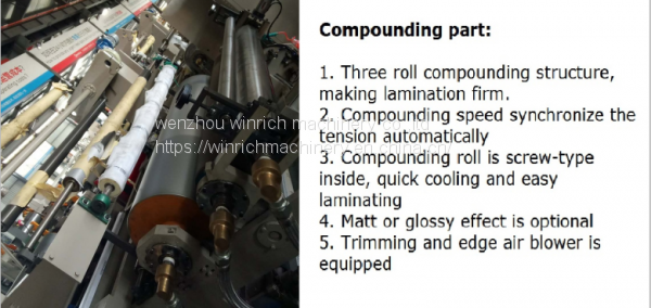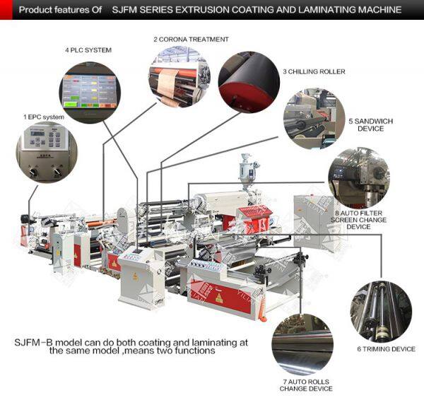 Sjfm series environmental protectional extrusion lamination machine, set unwinding and rewinding, drying, surface treatment,extrusion, compounding, trimming, suction side as a whole;it features with web guiding, corona treatment, line speed, meter counting; automatic tension control, temperature control and other advanced technology. Running speed 100-150m/min.