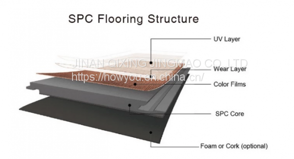 It takes PVC powder and calcium powder as raw materials, it consist of four layers. UV coating, wear layer, color film, spc core, foam or cork. they are ery popular for home use because they are not easy to be mold and not easy to be deformed, warped, and they are waterproof. The most important thing is that they are 0 formaldehyde.