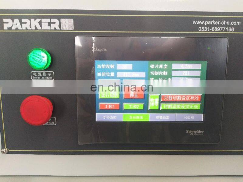 7.Imported high quality hard metal saw blade-WEMARO; servo motor and PLC-OMRON; touch screen-Eview; squar guide rail-HIWIN.
