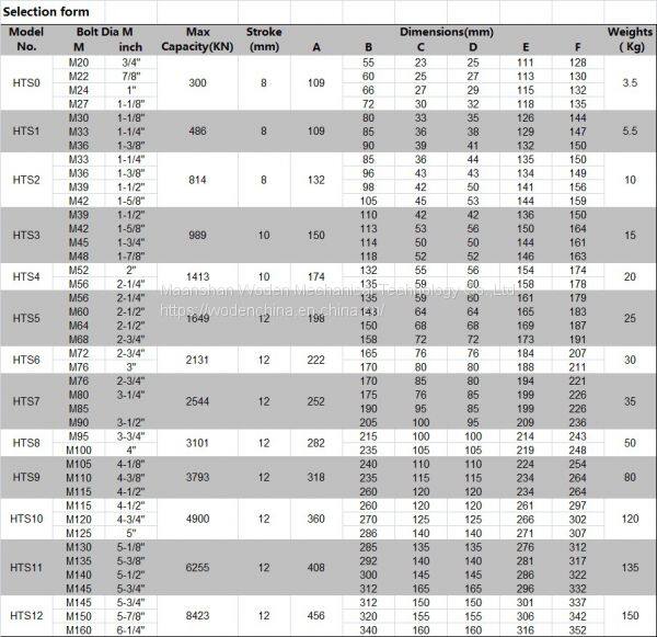 The max pressure is 1500 Bar, covering all bolts of M20-M160, and the tensile force range is 300KN-8423KN.