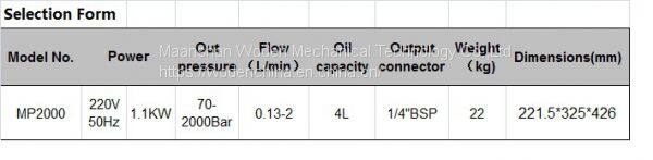 | Model Number | MP2000 | Type | Other, electric hydraulic pump |