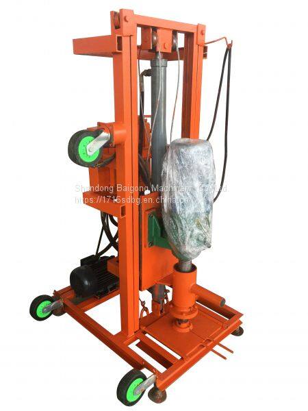 Hydraulic lift electric drilling rig is a new mechanized drilling rig with high efficiency,light weight,economy and practicability producted by our factory.Its advantage are:large torque,small volume,portable,high efficiency,easy operation,low noise and adaptability to various environmental topography.The machine is easy to use ,simple to operate,fast to form holes.It can be opetated by a single person at about 10meters per hour.It can dump the drill pipe mechanically.Taking a well drilled at 100 meters as an example,the average time of drill pipe disassembly takes about 10minutes.After completion of drilling operation,the machine can be moved by a single person.
