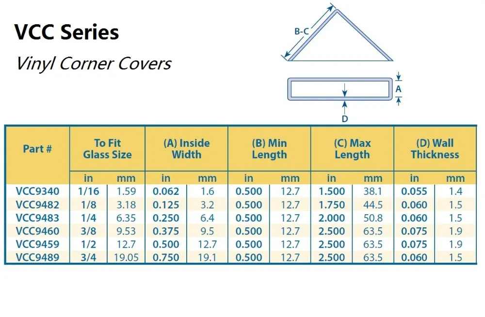 MOCAP Vinyl Plastic Corner Covers are flexible but tough corner protectors. These plastic corner covers stretch just enough for a perfect fit on the corners of glass and other flat square corner products. MOCAP Corner Protectors are stocked in sizes to fit most common sizes of plate glass.