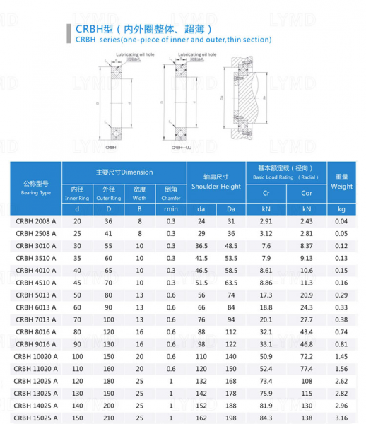 CRBH series cross cylindrical roller bearings, this model is ultra-thin RU series bearings, due to the use of ultra-thin design and outer ring and inner ring without mounting holes, the installation needs flange and support seat fixed.In addition, since the outer and inner rings are of integral structure, the installation has no influence on the performance, so the stable rotation precision and torque can be obtained, which is suitable for the occasions where the outer and inner rings are rotated but the size is miniaturized.