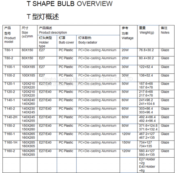 T140-1 E27/40 Large Size T Shape 60W LED Lights Component of PC Cover&cup