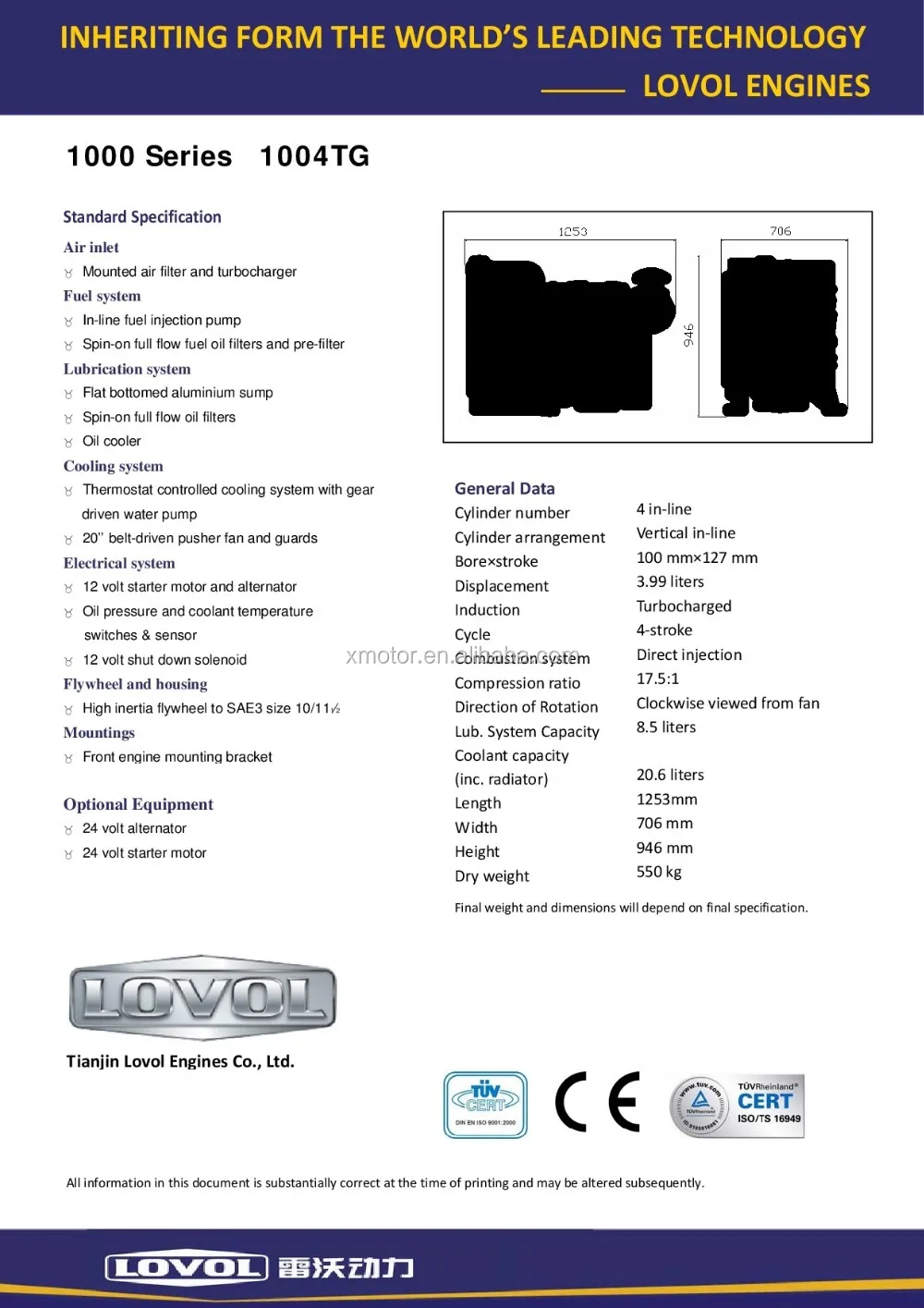 LOVOL engine derived from the Sino-UK joint venture Perkins China factory, based on original PERKINS technology. Currently, LOVOL engine includes B series, D series and LOVOL 1000 series, 1100 series and the platform of 3 cylinder, 4 cylinder and 6 cylinder, with power output ranging from 26kw to 202kw and speed from 1500rpm to 2600rpm. The engine can be widely applied to vehicle, construction euqipment, agricultural machinery, power generation, marine ect.