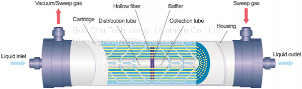 membrane contactor is a kind of special hydrophobic hollow fiber array made of polymer material. Then the array is spiral-wounded onto a water distribution tube, and then the tube is installed into a housing (at the same time, a baffler is formulated inside the housing).